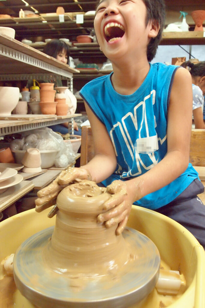ぐるぐるぐるぐる、電動ろくろに挑戦だ!夏休みの宿題として自由研究としてもおすすめです。