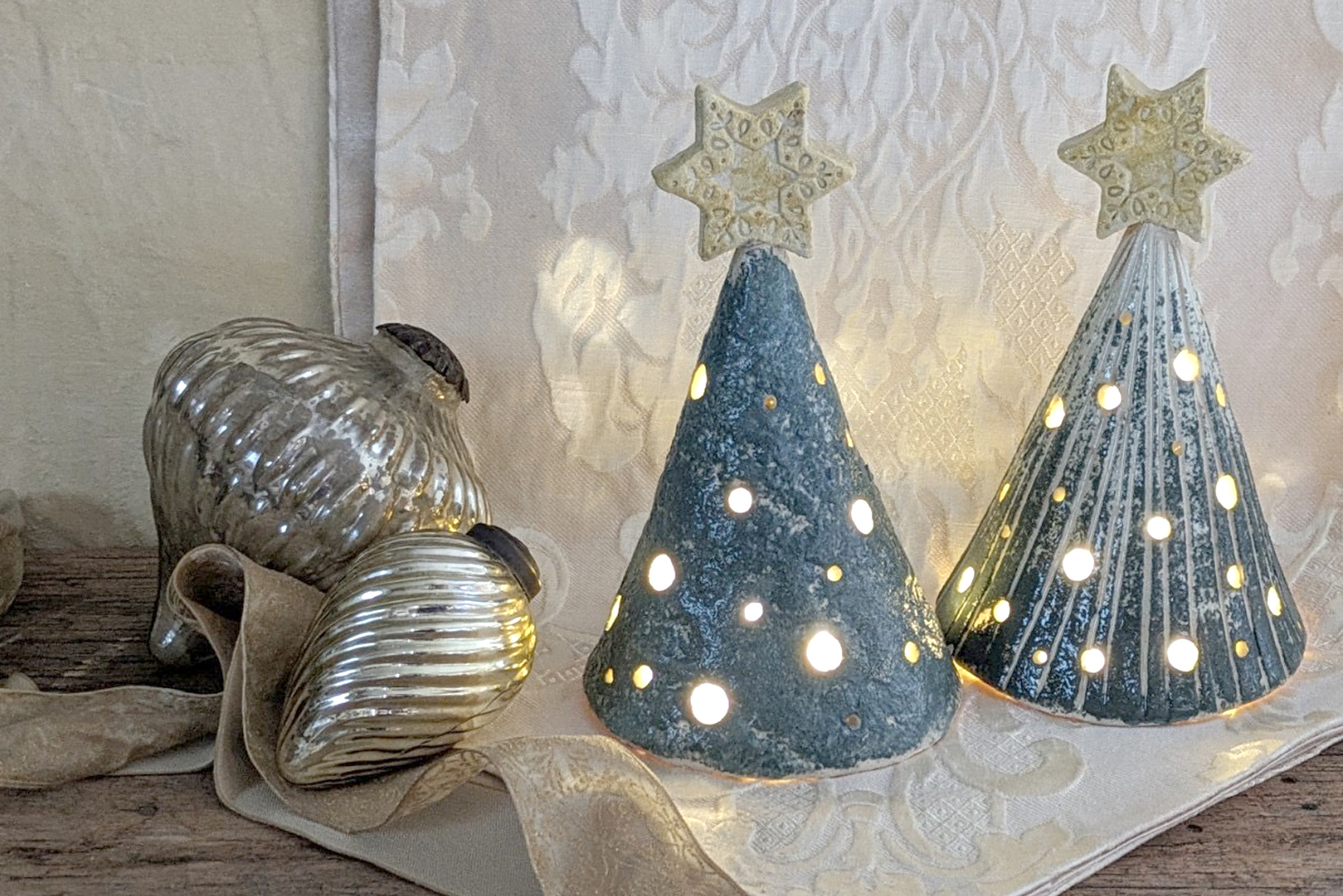 陶器のやさしい灯りと過ごすクリスマスはいかがですか?粘土の板にもみの木の模様をつけたり色を塗ったり自分好みにつくる世界にたった一つのお手製ライト!!陶器から漏れる優しい灯りがお家の空間を彩ります。